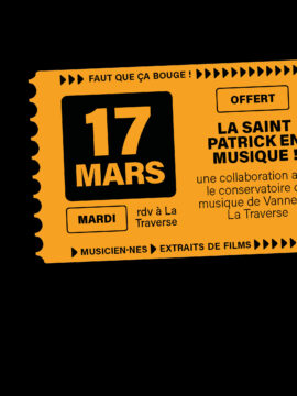 « S’il y a bien un moment festif où Cinécran et La Traverse ont envie de s’associer, c’est la Saint Patrick ! Le Super 8 ouvre grand ses portes (et ses oreilles) pour les élèves du conservatoire de Vannes. À l’écran, un mash-up d’extrait de films en lien avec la culture celtique, au bar et sur scène, un tas de surprises et de bières à découvrir. »